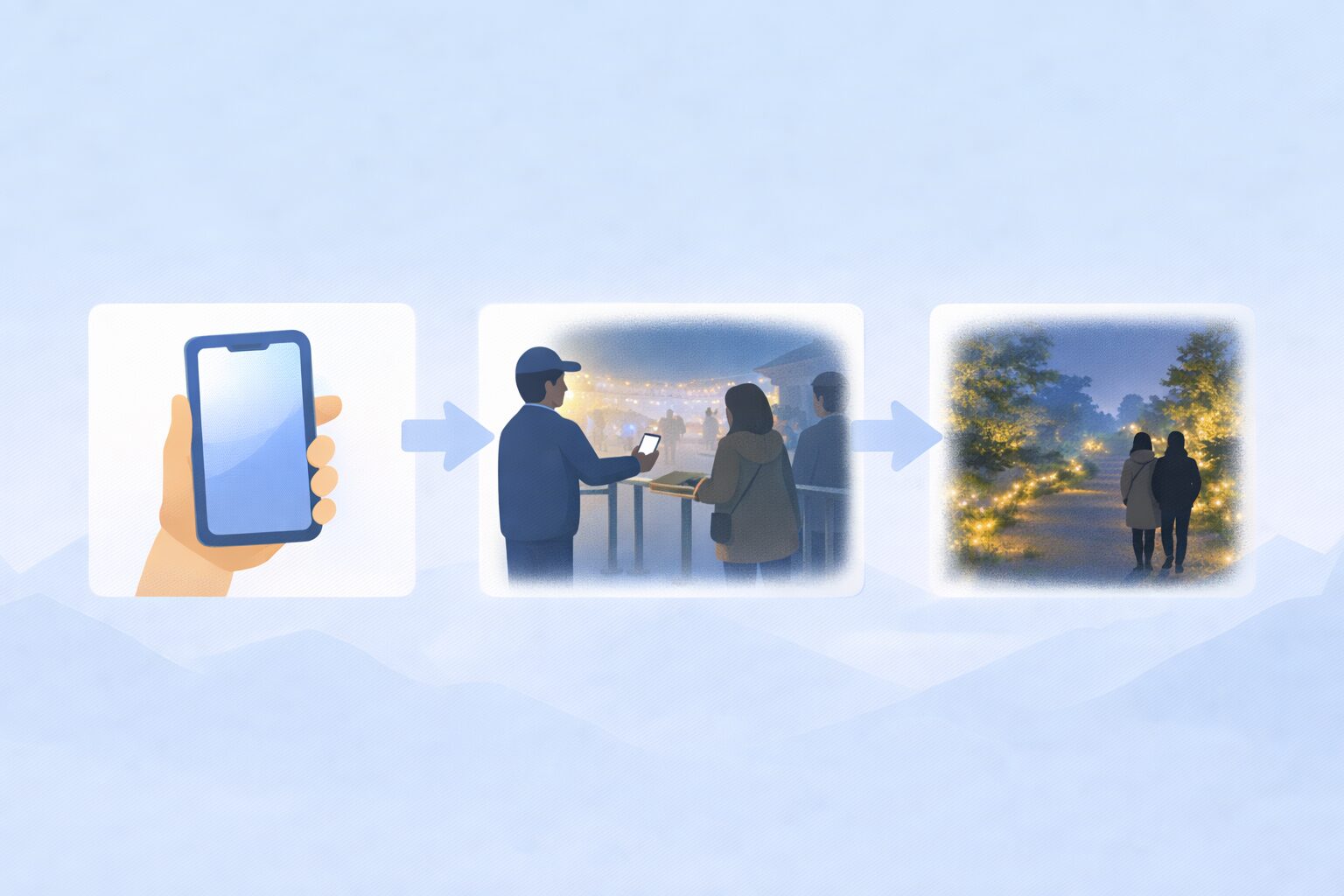 京都府立植物園ライトアップのチケットは、入場時間枠(何時〜何時の枠、みたいなもの)で運用されることが多いです。購入した枠に合わせて来場し、入口でQRを提示して入場します。この「時間枠」って言葉、慣れてないとピンと来ないかもですが、映画館の入場みたいなイメージが近いです。