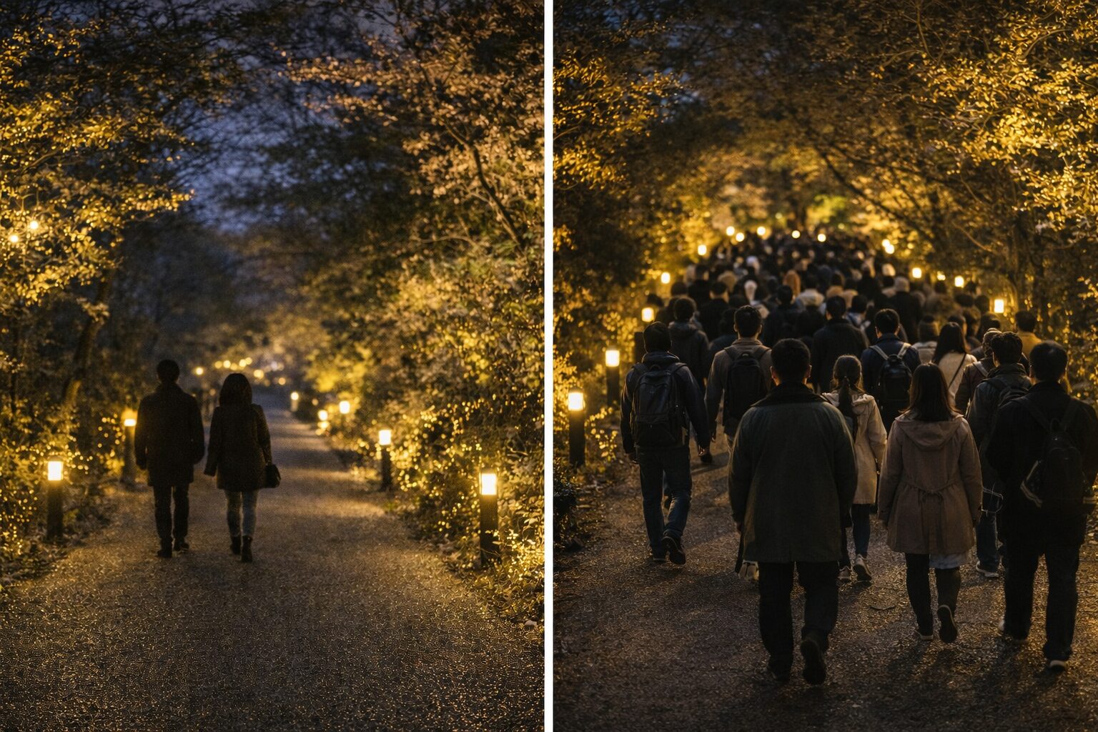 あともうひとつ。昼の通常開園の入園料と、夜のライトアップは別料金です。「昼に入園してるから夜は割引されるはず」って混同しやすいんですが、ここは別枠と考えるのが安全です。昼と夜をセットで楽しむなら、昼は昼、夜は夜で予算を見ておきましょう。